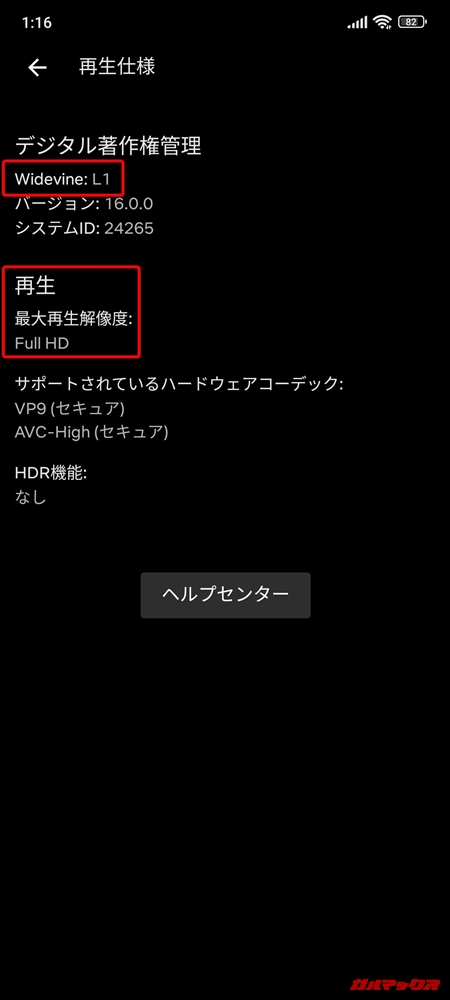 | DRMコンテンツ | Widevine:L1 Amazonプライムビデオ:HD(高画質)で再生確認 Netflix:FHD画質で再生を確認 |