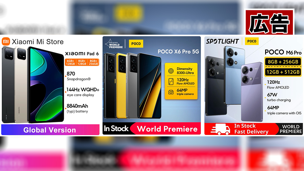 春と言えばAliExpressのセール!という訳でこの時期になるとお得情報がビシバシ入ってくる。今回は人気モデル「POCO X6 Pro」「POCO M6 Pro」「Xiaomi Pad 6」の3モデルが対象!!!安い時に是非手に入れて欲しい。