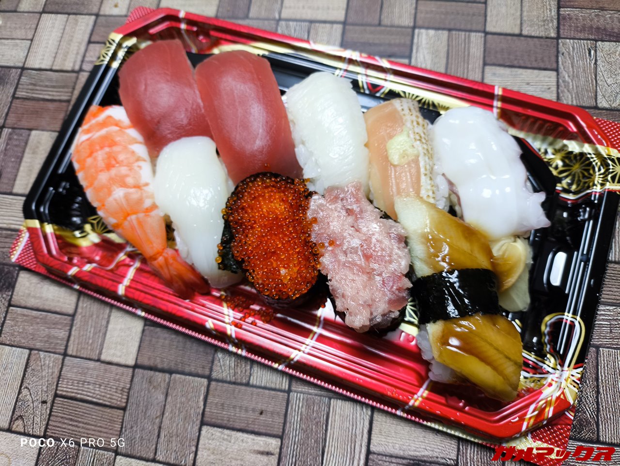 ▼飯撮り。肉眼で見比べてみたら若干ホワイトバランスは寒色寄りでした。300円パックの激安スシ。↓