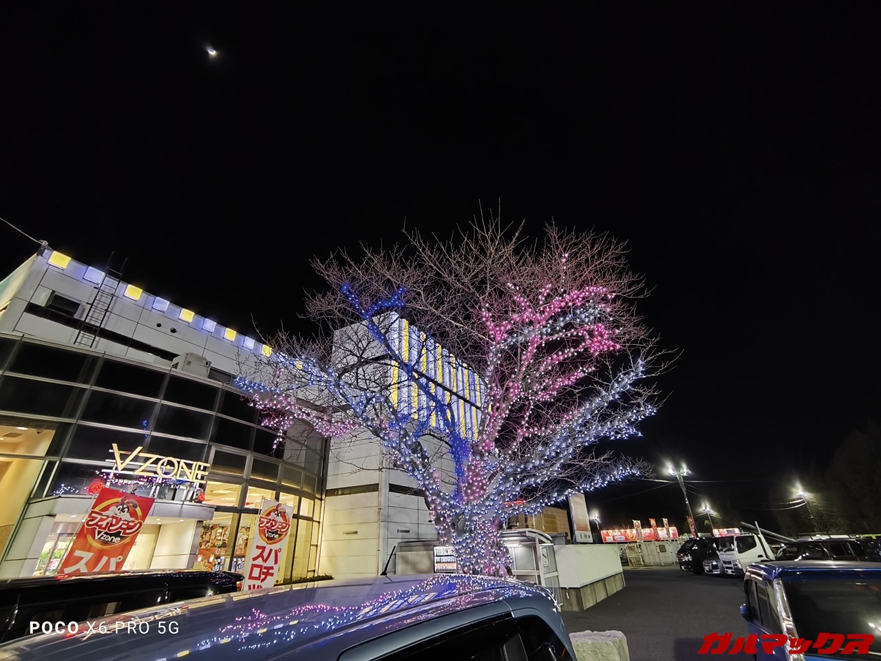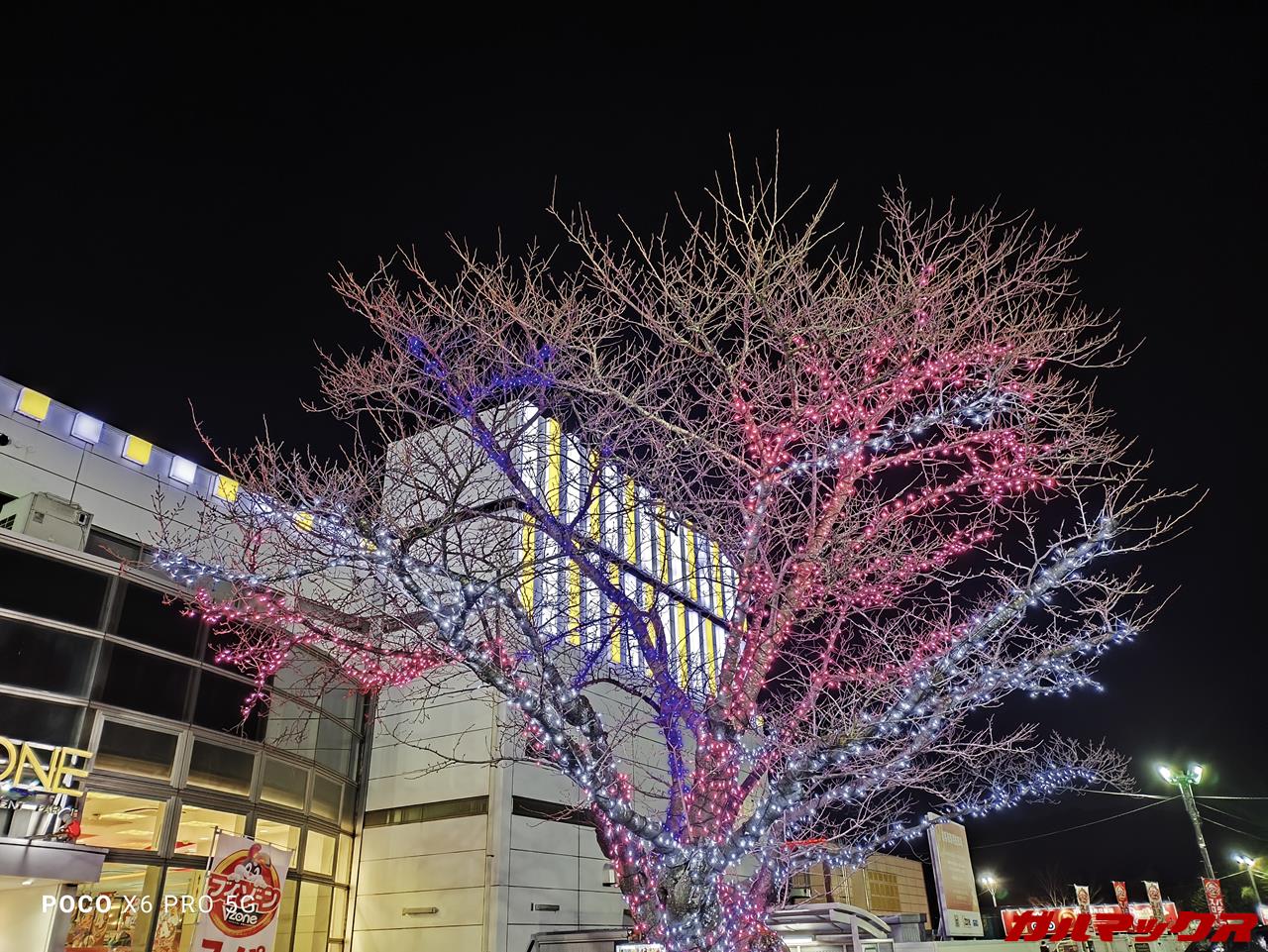 ▼夜景撮影を試しました。電飾付きの木だとこんな感じ!LEDの色から木の枝の細部もよく捉えられています。↓
