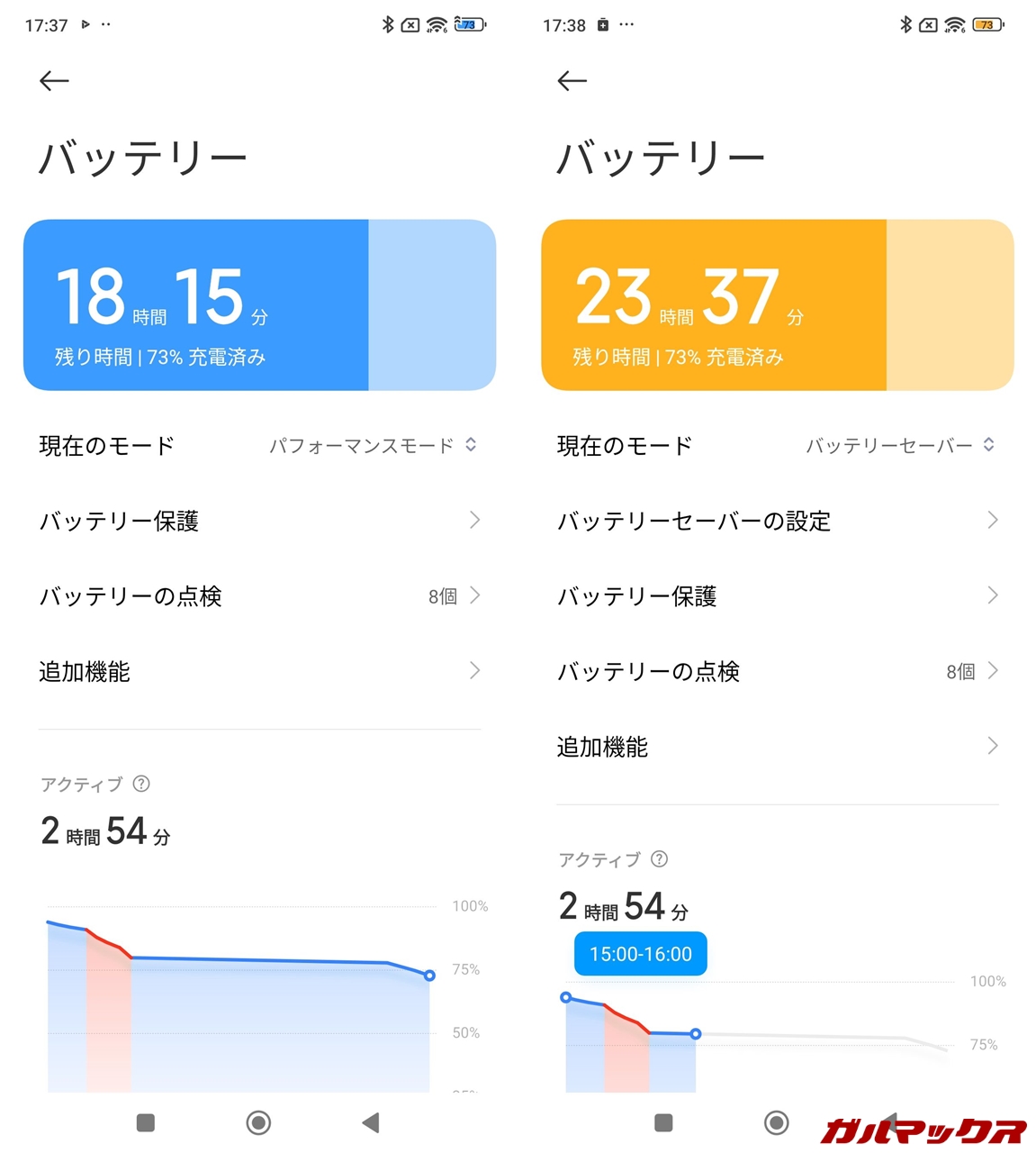 ▼バッテリーの設定から性能を最大まで引き出すハイパフォーマンスモードも選べます。オンのときはバッテリーが青くなるのが特徴。逆にバッテリーセーバーモードも選べて、こちらは黄色くなるようになっています。↓