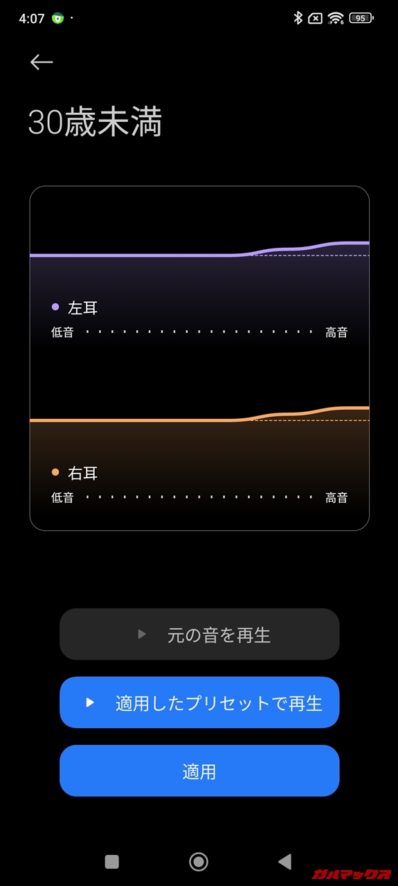 ▼その他、年齢に応じた聴覚カスタマイズにも対応していました!これもいままで見たことなかった機能。30歳未満だと高音のみが増幅され、年齢が上がるに連れてその増幅度合いが上がっていきます。カスタマイズも可能。↓
