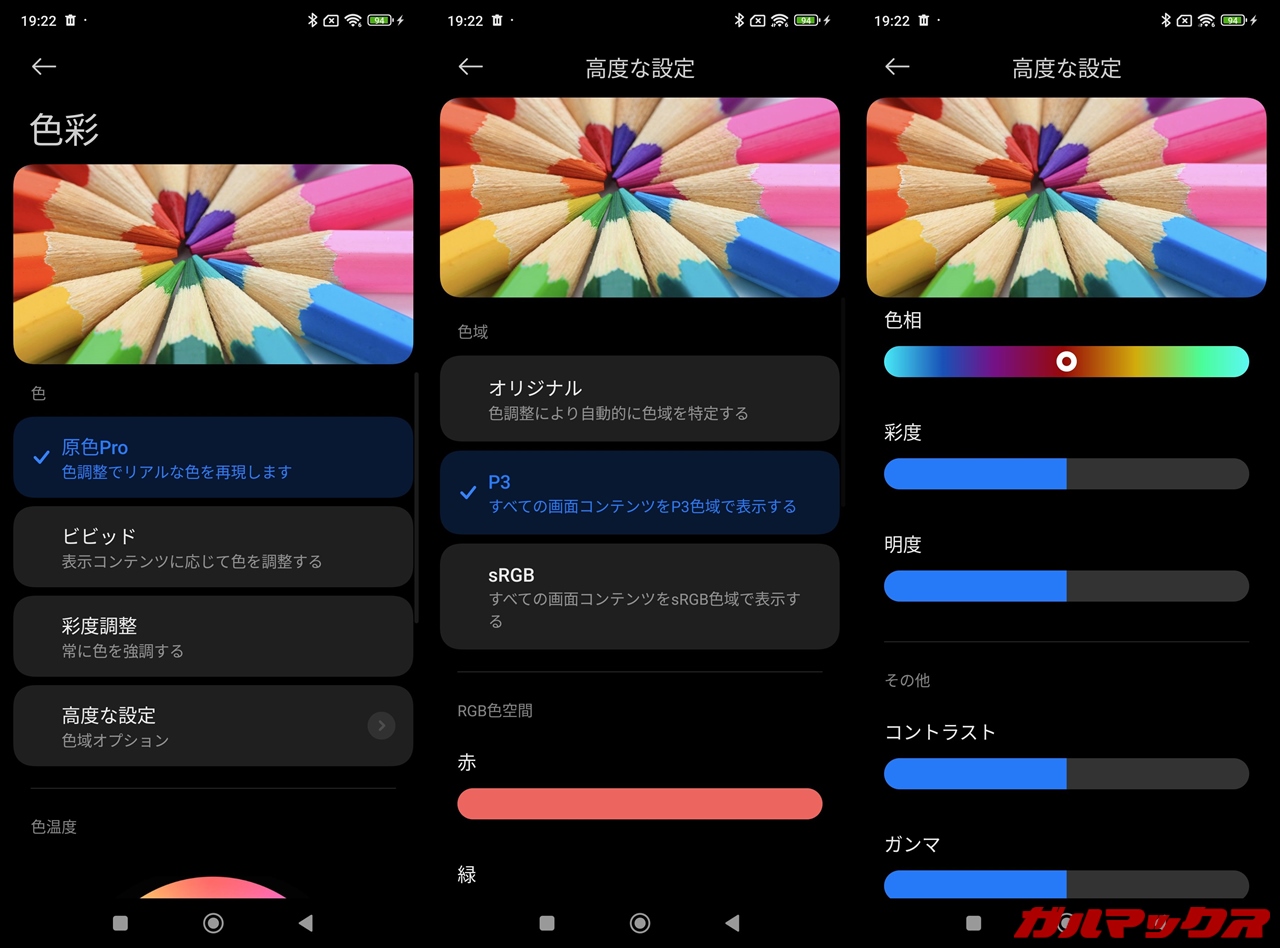 ▼ちなみに設定画面も専用の設定が組めます。ディスプレイの色彩メニューから、原色重視で表示させたり、sRGBまたはP3での色域表示にも対応。チューニングまでできちゃいます。拘る人にとって満足できるかも。↓
