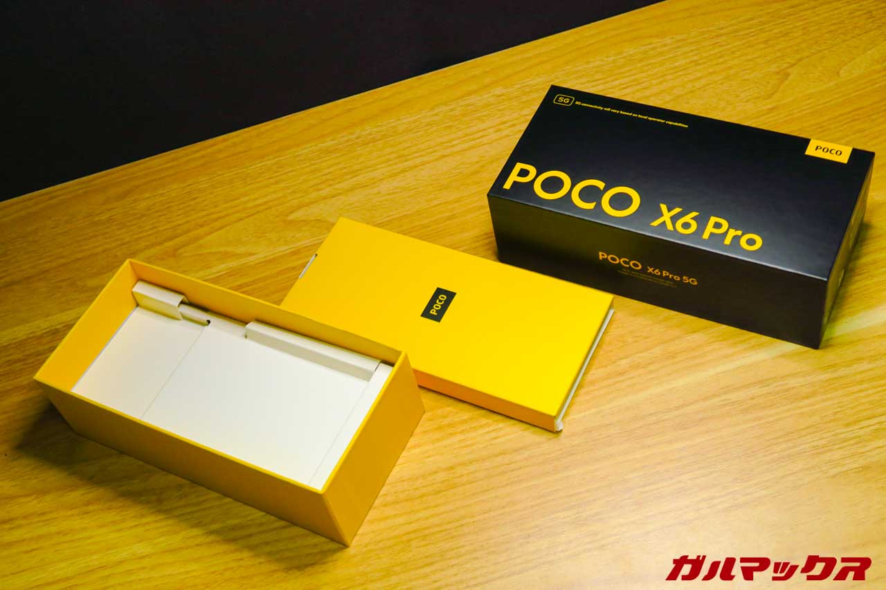 ▼発表記事書いてた時から気になってたPOCO X6 Pro、思った以上に早く手に入りました。クッソ嬉しい。外箱はPOCOおなじみの黄色と黒のツートン。↓