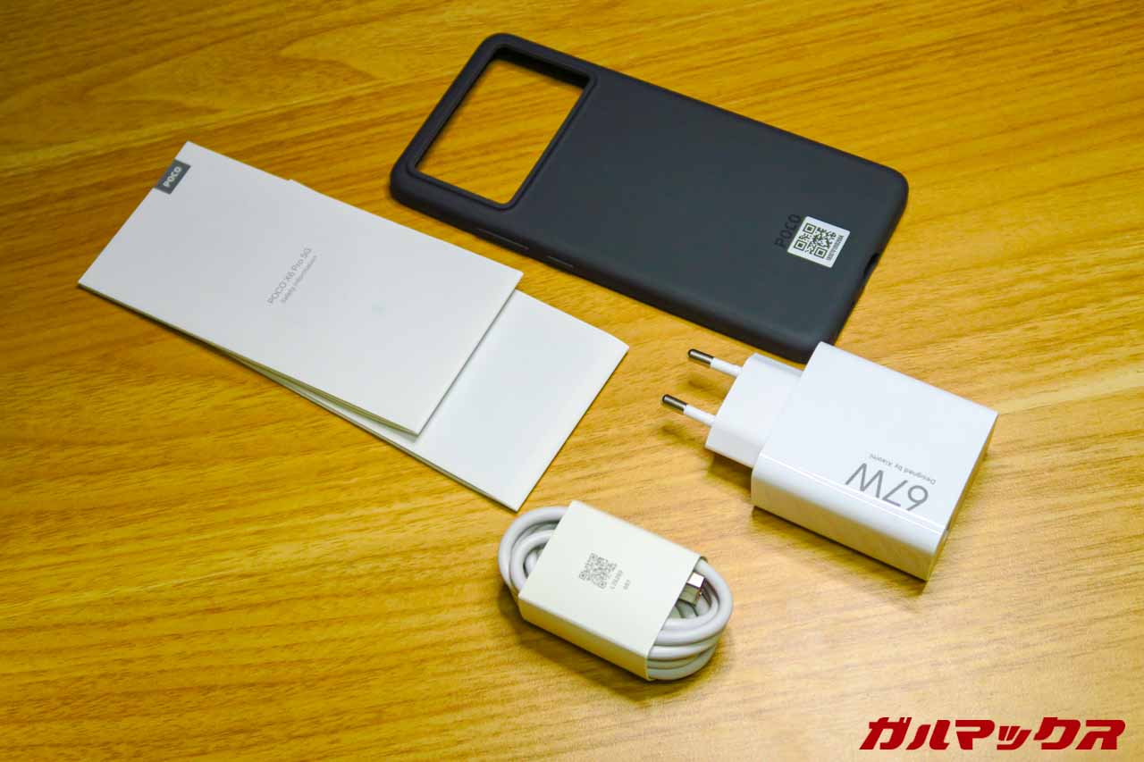 ▼POCO X6 Proの付属品はこんな感じでした!最大充電規格まで対応する充電器もバッチリ付属。ただ海外プラグなんで変換アダプターは必要です。海外スマホあるある。↓