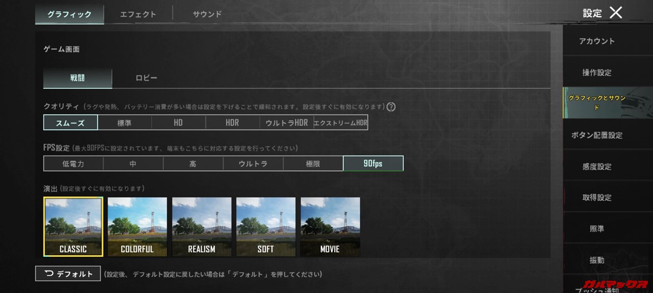 ▼PUBG:Mobileはスムーズ+90fpsに対応!ヤッフー!あと90fpsよりワンランク低い「極限」設定であれば画質をHDRまで上げられました。↓