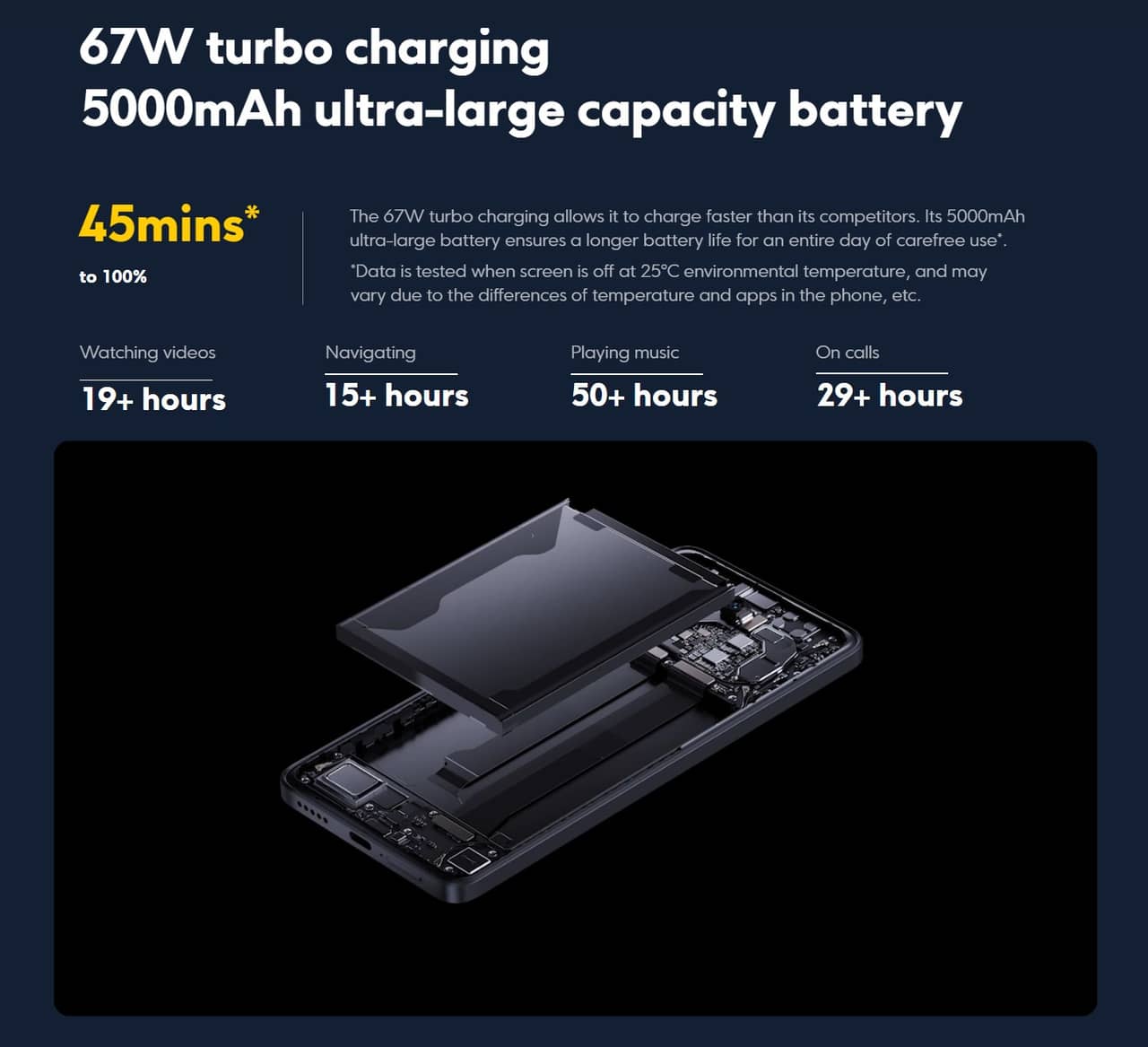 バッテリー容量は5,000mAhと大きめ、尚且つ67Wの急速充電も対応!