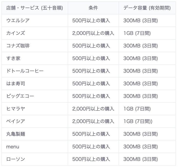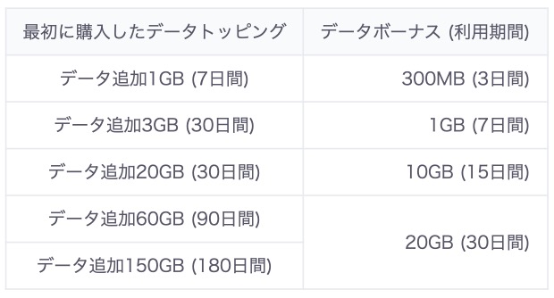 貰えるデータ容量(データボーナス)は以下の通り