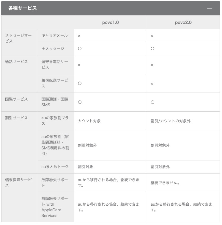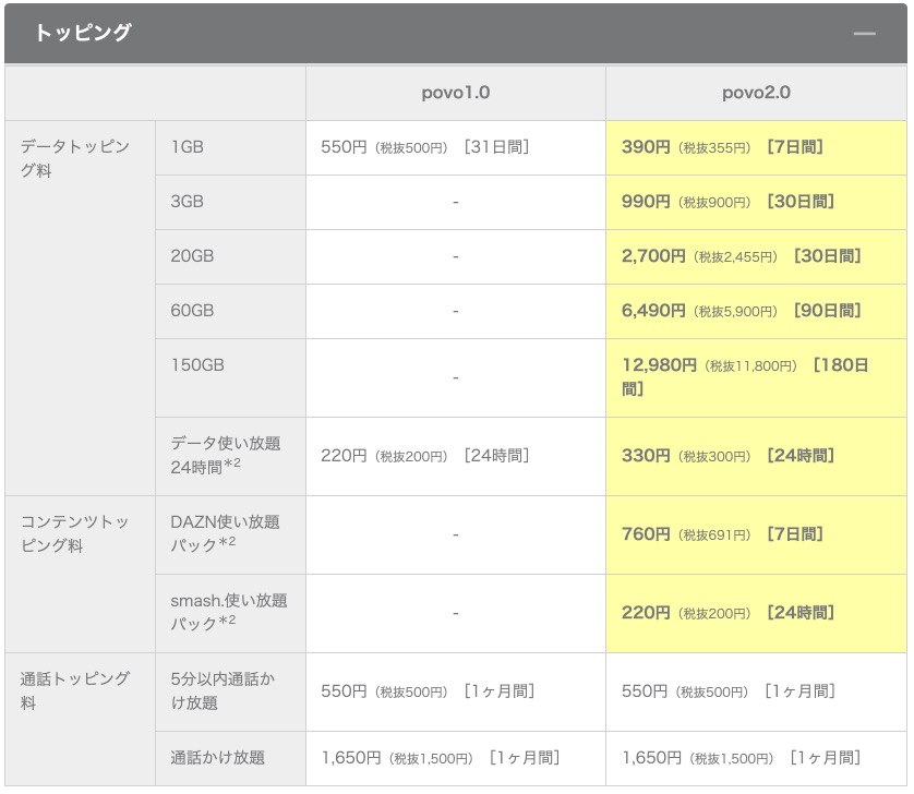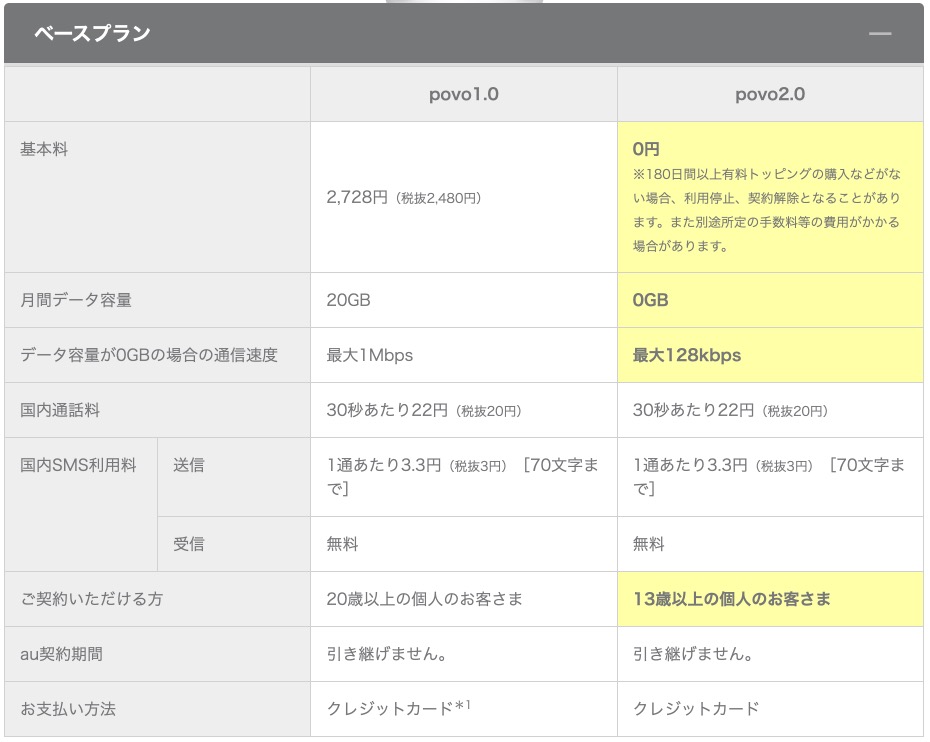 povo1.0 / povo2.0比較表では現行のpovo(名称変更後はpovo1.0)との比較が掲載されてます。