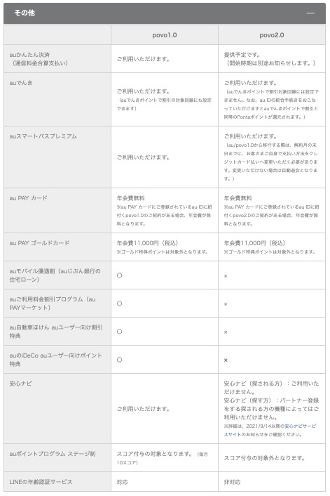 個人的に注意すべき点をピックアップすると、auかんたん決済がpovo2.0では「提供予定」となっているので、早期乗り換えでは一時的にauかんたん決済が利用できなくなりそうです。