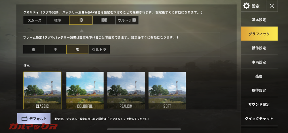 ▼まず以下の設定を御覧ください。これはiPhone XSでPUBG Mobileをインストール後に自動設定された状態です。グラフィックのクオリティは「HD」フレーム設定は「高」となっています。↓