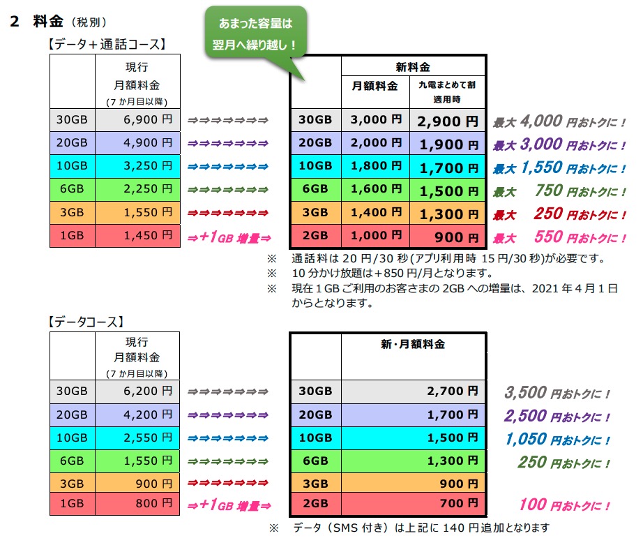 3GB以上のプランはデータ容量変わらず月額料金がかなり安くなってますね。1GBプランは増量され2GBプランに刷新。これで利用料金も450円値下がってるんでかなり頑張ってる。データ繰り越しOKなのも良いよね。