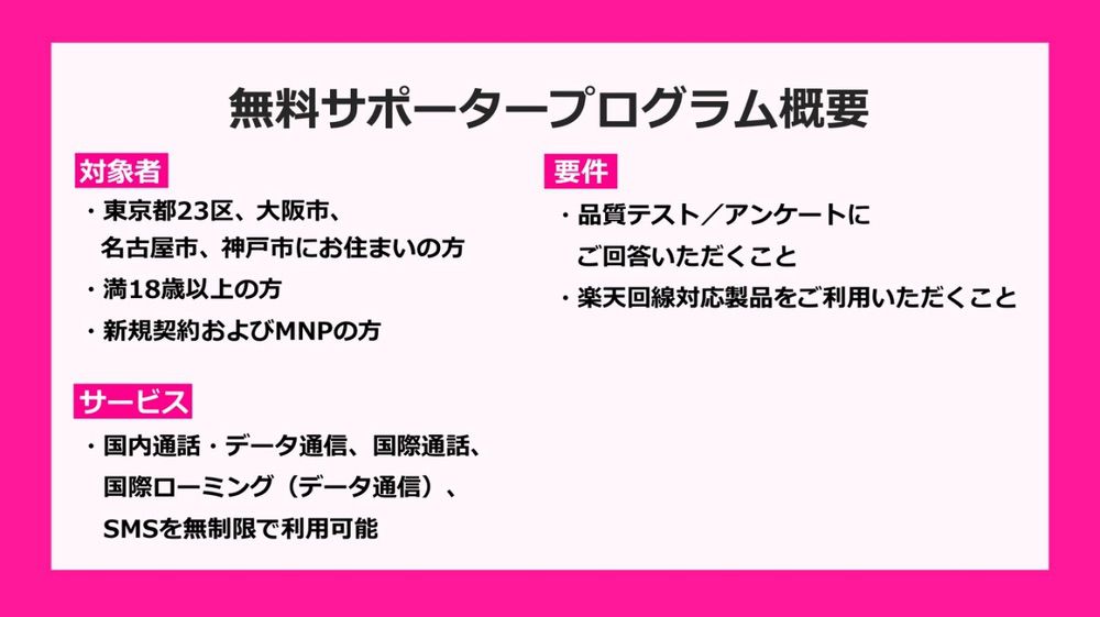 「無料サポータープログラム」は2019年10月1日(火)より「楽天モバイル」公式ウェブサイトで受付スタート。申込可能対象者、要件は下記の通りです。