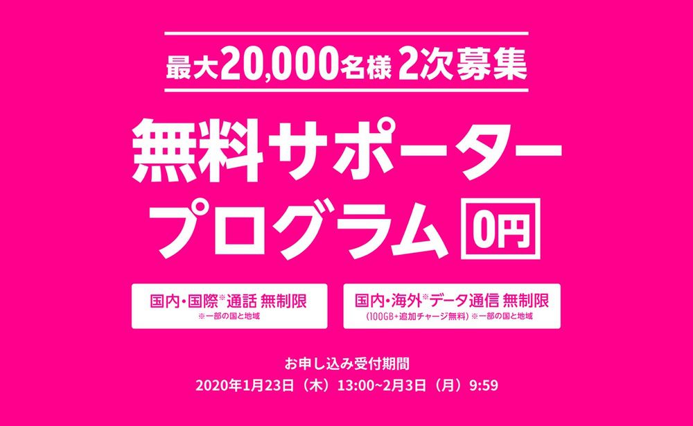 昨年10月から人数を5000人に限定してスタートした楽天モバイルの無料サポータープログラムが1/23から2時募集スタート!