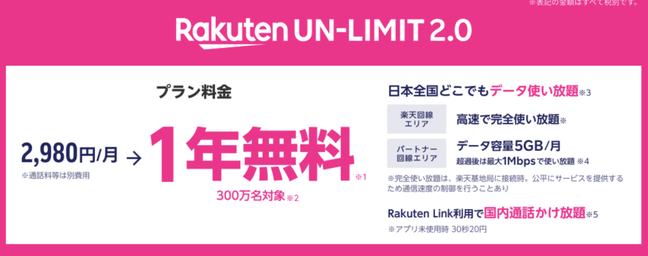端末とセットで申し込むプラン「Rakuten UN-LIMIT」は楽天回線ならデータ使い放題、パートナー回線なら5GB付き、通話もRakuten Link経由で無料!しかも先着300万人限定で月額3,278円が1年間無料!