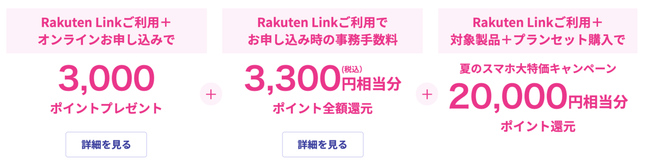 3000ポイントキャンペーンや事務手数料相当の3,300円相当ポイント還元キャンペーンは、Rakuten Linkの条件クリア期間が長いんよ!でも、端末購入で20,000円相当ポイント還元キャンペーンは同条件のクリア期間が何故か短い!