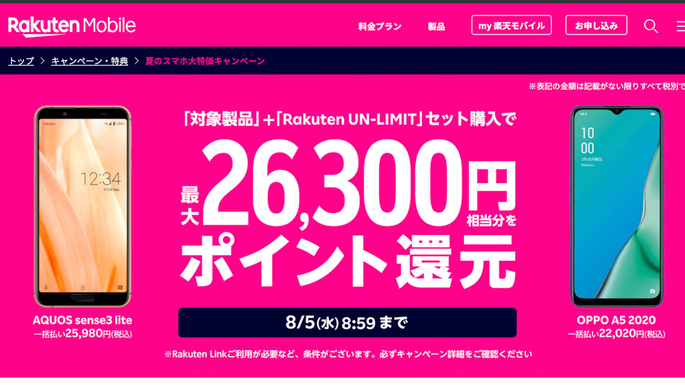 なんとですね、楽天モバイルが開催している最大26,300円相当のポイント還元キャンペーンが2020年8月5日(水)8時59分まで開催しているんだけど、なんと、スマホが実質0円以下で手に入っちゃいます!