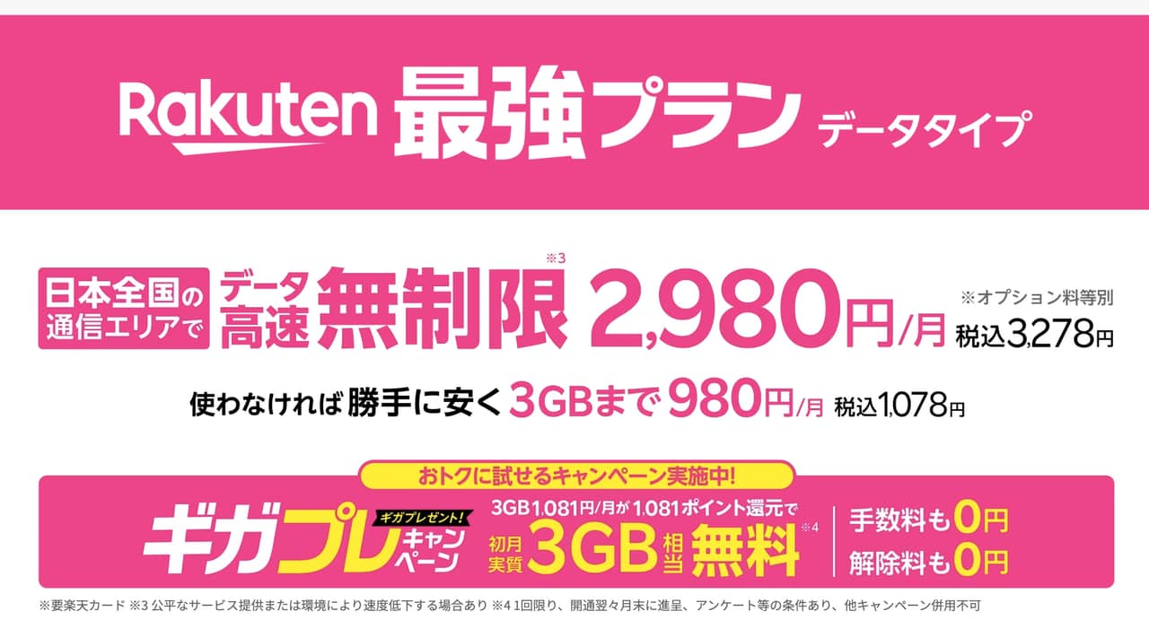 楽天モバイルがデータ専用プランを2023年7月3日より提供開始!利用料金は3GBまで1,078円とここまでは音声通話プランと同じですが、データ専用プランは3GBを超えると一気に月額2,980円/無制限の2段式となっています。