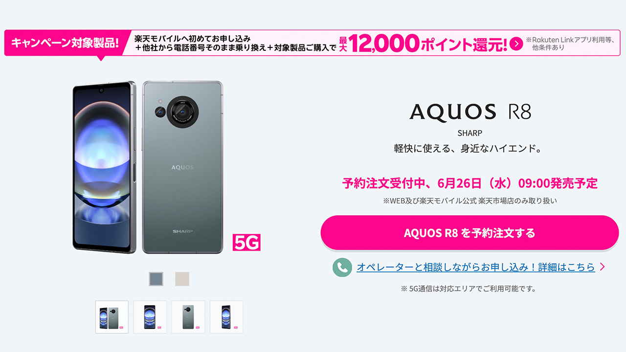今まではドコモや格安SIMのmineo・IIJmioなどが取り扱ってきたAQUOS R8ですが、楽天モバイルで予約受付がスタートしています。販売開始は6月26日から。