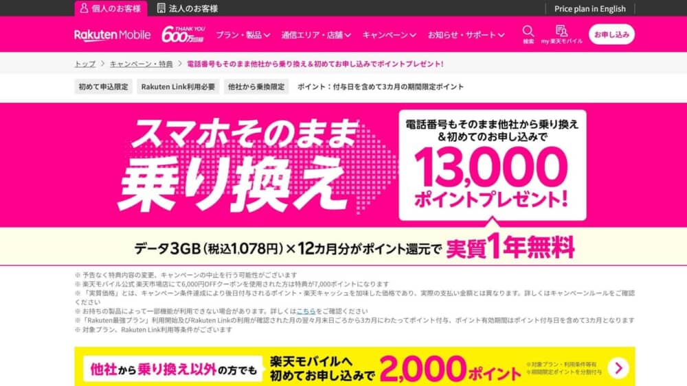 楽天モバイルの申し込みが初めての方限定!MNPで貰える特典が13,000ポイントに!3GBは実質1年無料!
