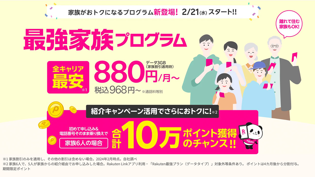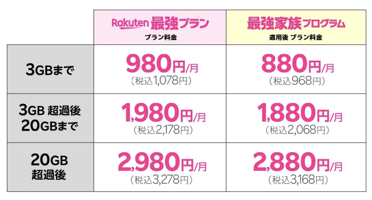 楽天モバイルを使っている人で発表時の最強家族プログラムの内容では適用出来なかった人も、今回のアップデートで対象がグッと広がっているので申し込んでおきましょう!