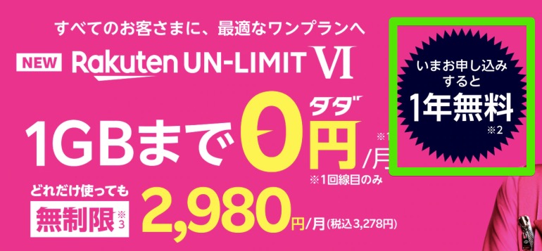 楽天モバイルは300万名限定で、月額1年間無料のキャンペーンをやってるんですが、この波に今乗れば、1年間の利用料金が0円になるのです。