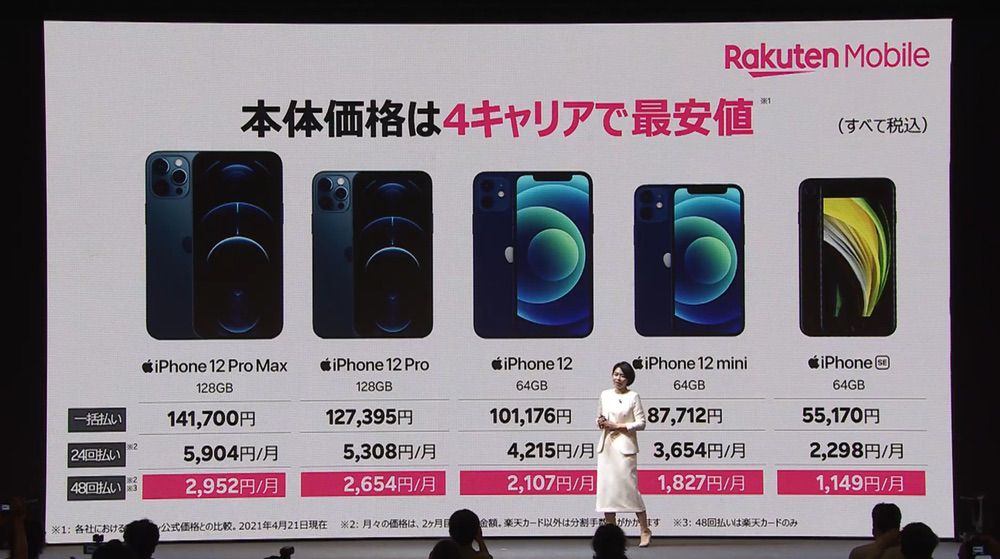楽天モバイルがオンラインカンファレンスでiPhone 12シリーズ・iPhone SE・AirTagを取り扱うと発表しました。iPhone 12シリーズは他社と比べて最安値だそうです。予約開始は4月23日21:00から。