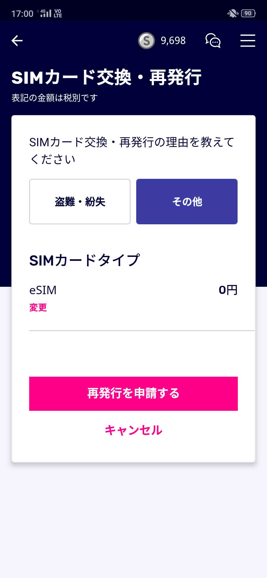 ▼発行の形態を変更してもらうのが目的なのでSIMカード交換・再発行の理由は「その他」、SIMカードタイプは「eSIM」を選択しました↓