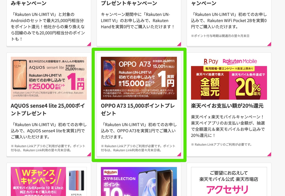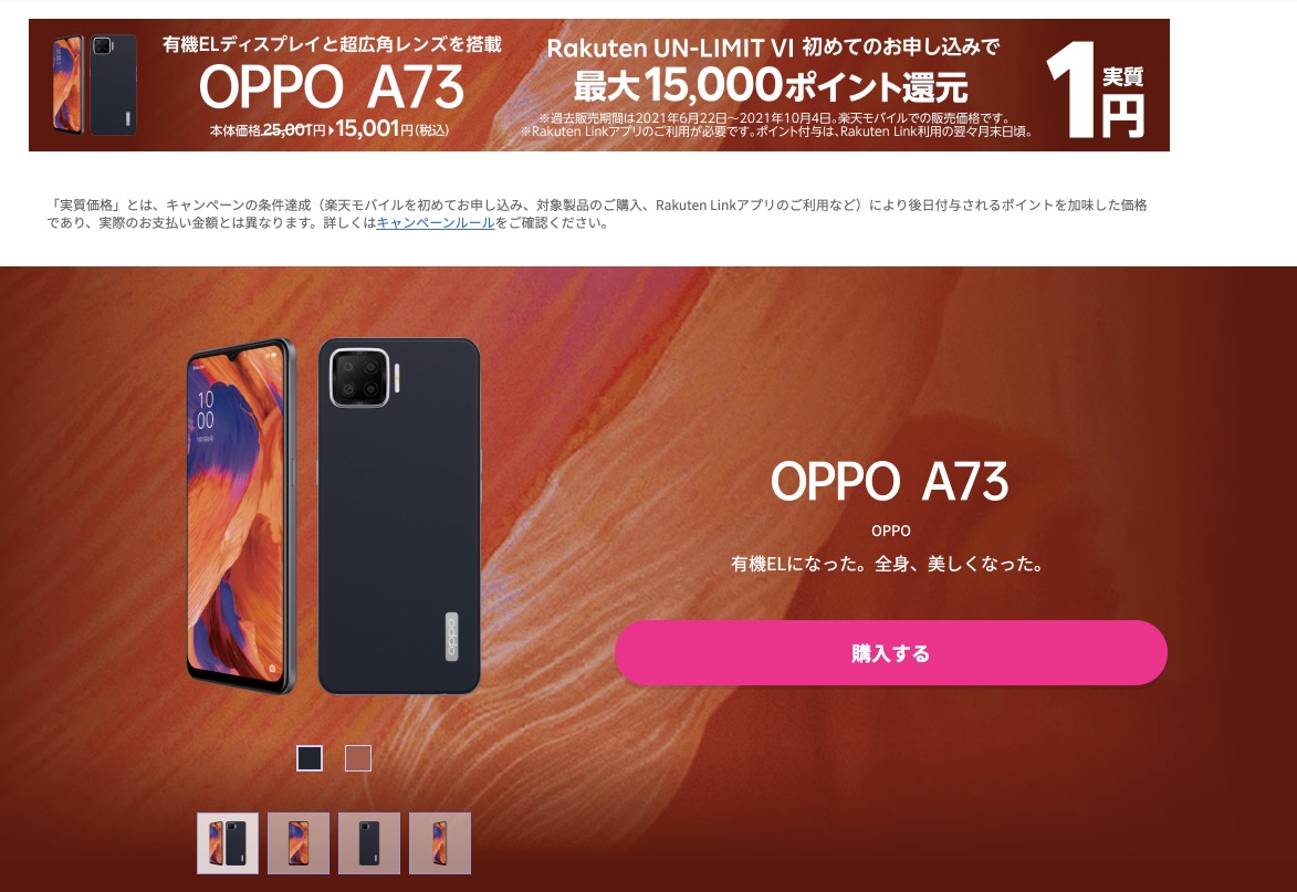 そんなOPPO A73ですが、楽天モバイルで2021年10月22日から実質1円で手に入るキャンペーンがスタートしてますよ!