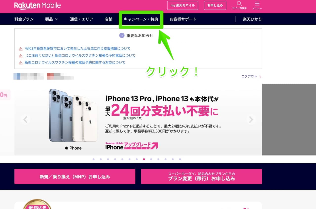 ▼キャンペーンページへの行き方は、公式サイトに飛んだら「キャンペーン・特典」をクリック!↓