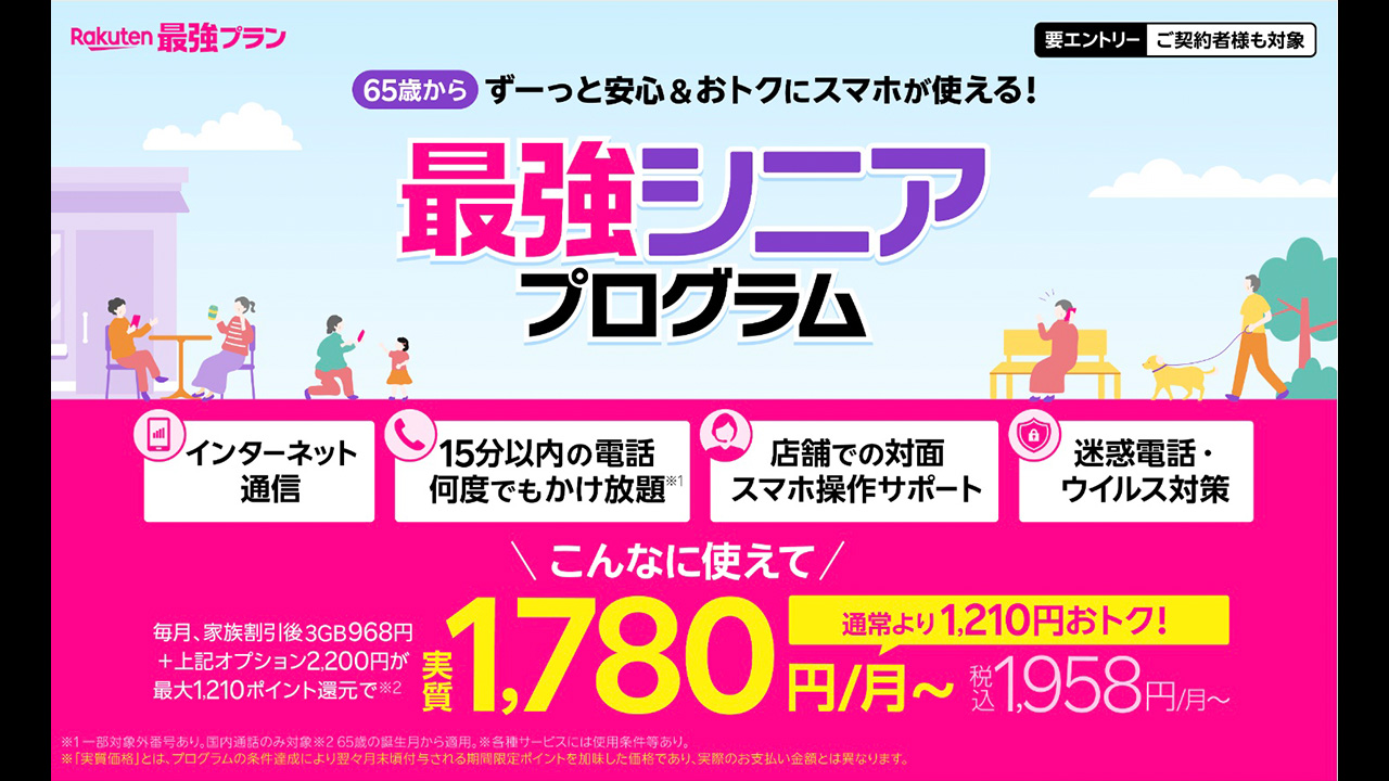 楽天モバイル「最強シニアプログラム」スタート。65歳以上は毎月110ポイント、指定オプション分もポイント還元