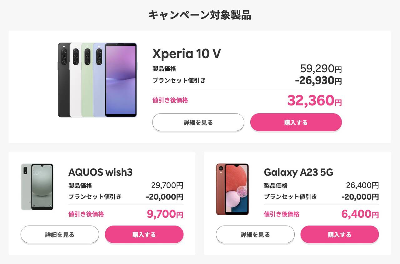 楽天モバイルでXperia 10 Ⅴ、AQUOS Wish3、Galaxy A23 5Gが割引。最大26,930円オフ