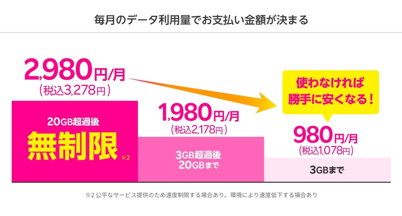 あと、データ量の区切りもコレまでと同じで、3GBまでなら1,078円、20GBまでは2,178円となっていますぞ。事務手数料もバッチリ無料!