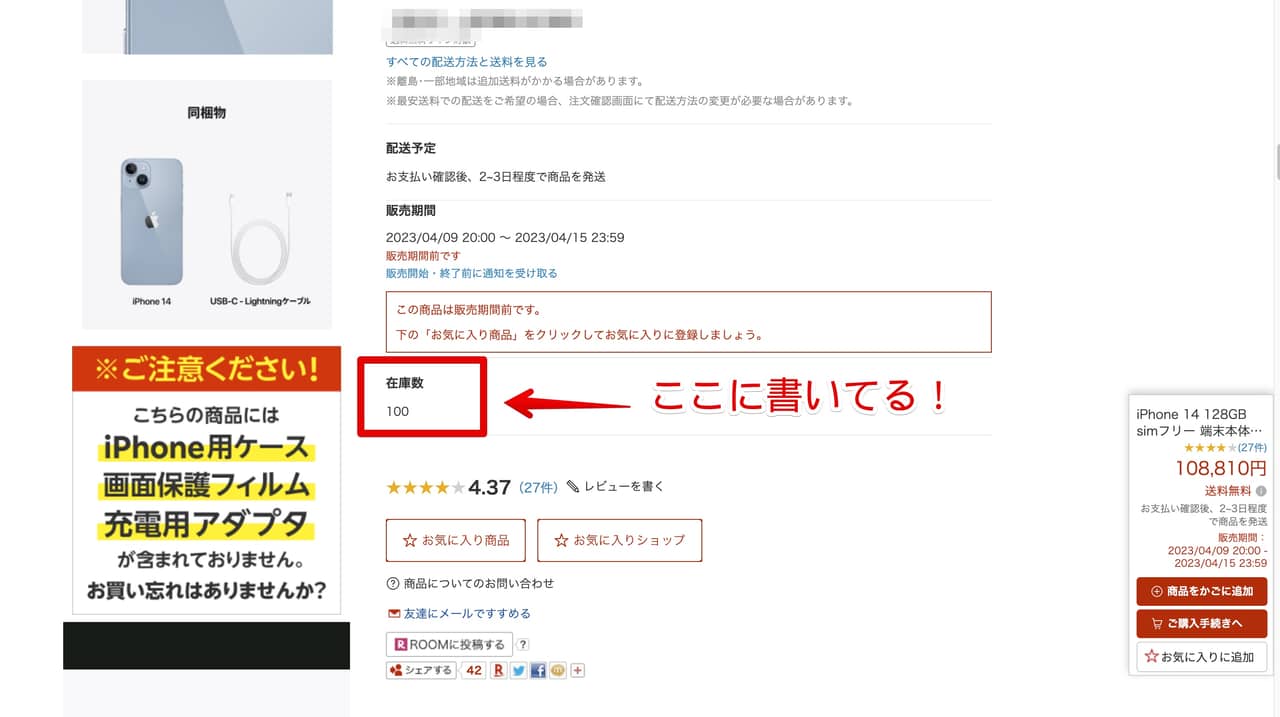 あと注意してほしいのが数量限定ってところ!サラッと確認してみたんだけど、例えばiPhone 14のイエローは執筆時点で在庫が68台、パープルだったら100台みたいにカラーによって在庫もバラバラなので、今のうちに狙っているカラーの在庫数のチェックをしておこう!