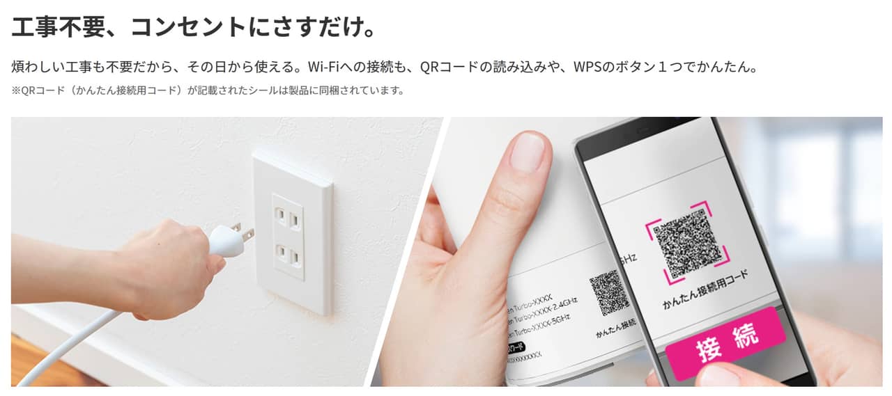 Rakuten Turbo 5Gは「置くだけで使えるタイプ」のWi-Fi。コンセントにさすだけを謳っており、工事は不要。