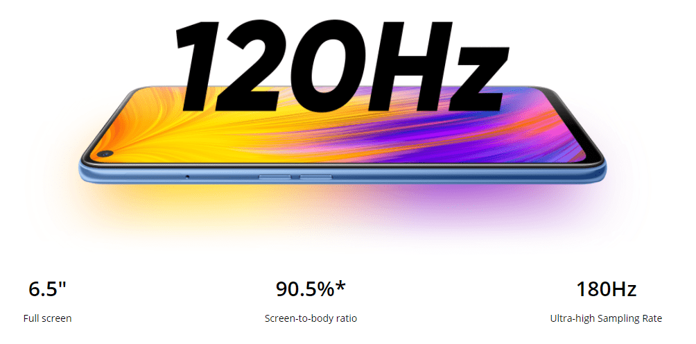 Realme 7 5Gの画面はサイズが6.5インチ、解像度は2,400×1,080、ディスプレイは液晶を採用しています。リフレッシュレートは120Hz、タッチサンプリングレートは180Hzです!