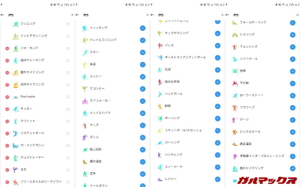 ▼Realme Band 2は90というものすごい数のスポーツモードに対応。聞いたこと無ぇ種目も多いレベル。ただし最初は基本的な種目しか入っておらず、その他のトレーニングはアプリから手動で突っ込む必要はあります。↓