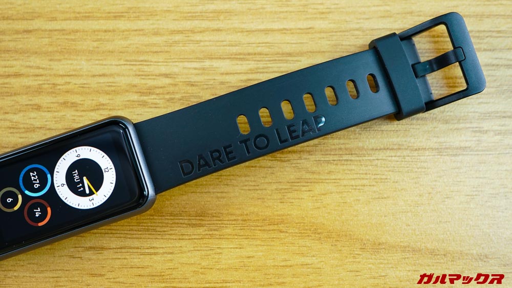 ▼バンドにもRealmeスマホにも見かけられる「DARE TO LEAP(思い切って飛ぶ)」の銘が彫られていました。スマホにも座右の銘的なものが彫られているものはありますが、こういうバンド部分のほうが派手さはなく、個性もあるので個人的にこういうのがいいなって思う。↓