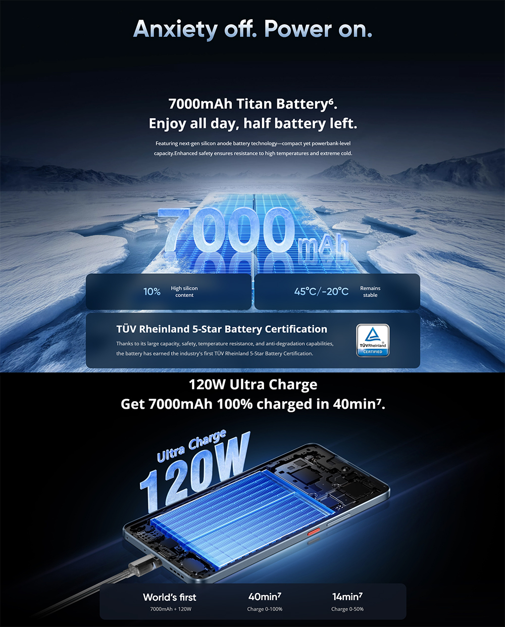 ▼バッテリー容量は大容量の7000mAh。中程度なら2日、ライトな使用では3日間持つそうです。120W(SUPERVOOC)の充電に対応しており、15分で50%、42分でフル充電が可能とのこと。↓