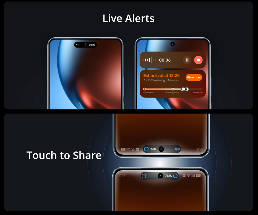 ▼音楽の再生、レコーダーの操作などが簡単にできるダイナミックな通知領域であるライブアラート、iPhoneや他のrealme端末とファイル共有が簡単にできるタッチして共有などに対応。↓