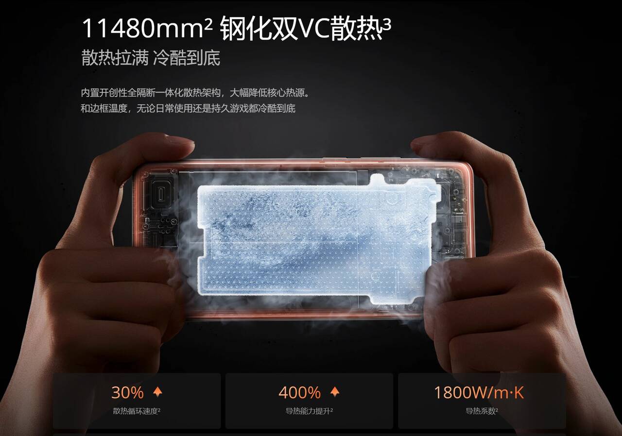 ▼さらに冷却パネルも11,480m2と超大型で放熱効率を高めており、公式曰く原神を4時間プレイしても60FPSを平均したとのこと!ゲーム向けスマホとして申し分ないといえます。↓