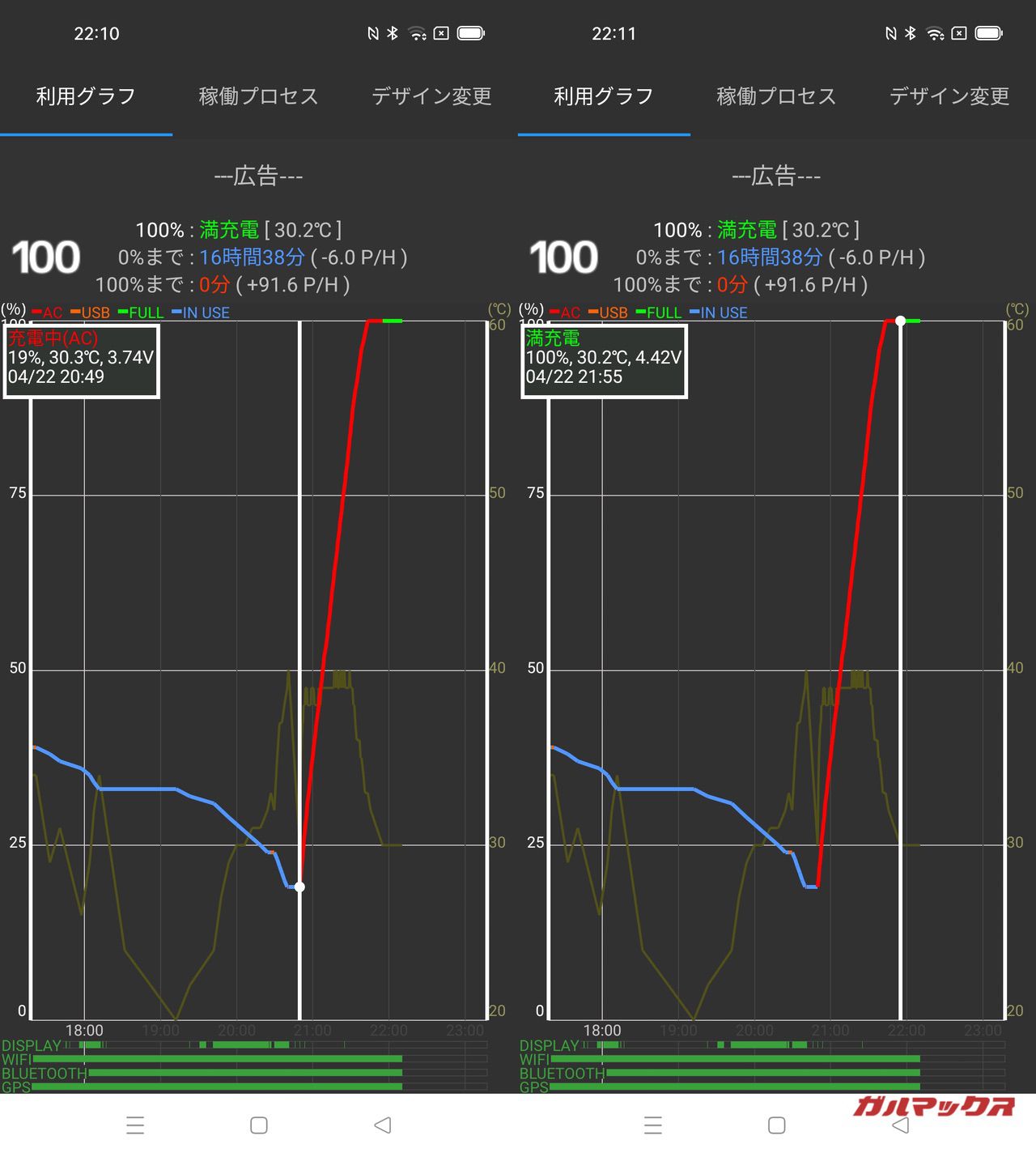 ▼充電は33Wの急速充電に対応。残量19%時点の20時49分時から充電して100%時点で21時55分。約1時間強で80%近く充電できるので、寝るとき充電忘れても朝の身支度時にある程度の充電はできそう。↓