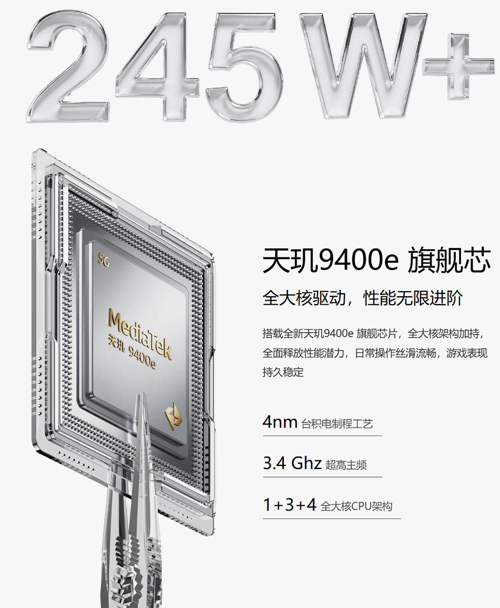 SoCにはDimensity 9400eを搭載。AnTuTu公称値は245万以上で、重量級のゲームも高画質で快適に楽しむことができます。