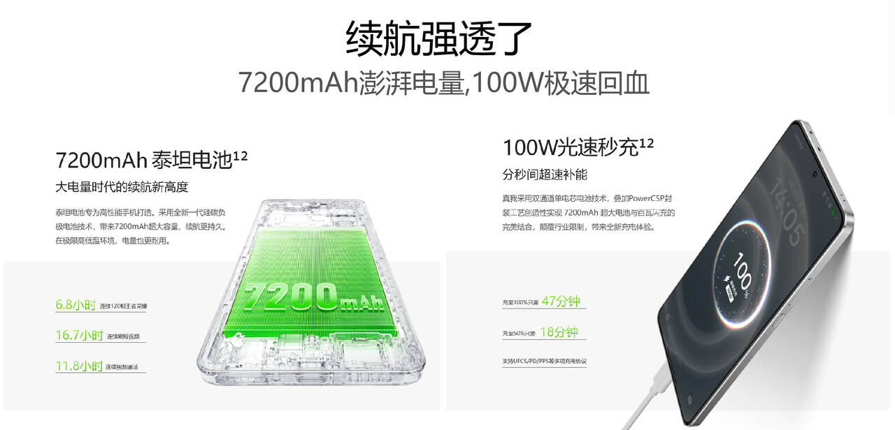 バッテリーは7200mAhと大容量。100W(SUPERVOOC)の急速充電対応で、18分で50%、47分で満充電が可能。UFCSやPPSなどの汎用充電規格にも対応しています。バッテリーではなく本体に直接給電するバイパス給電にも対応。ケーブル刺しっぱでゲームしてもバッテリーが傷みにくいです。