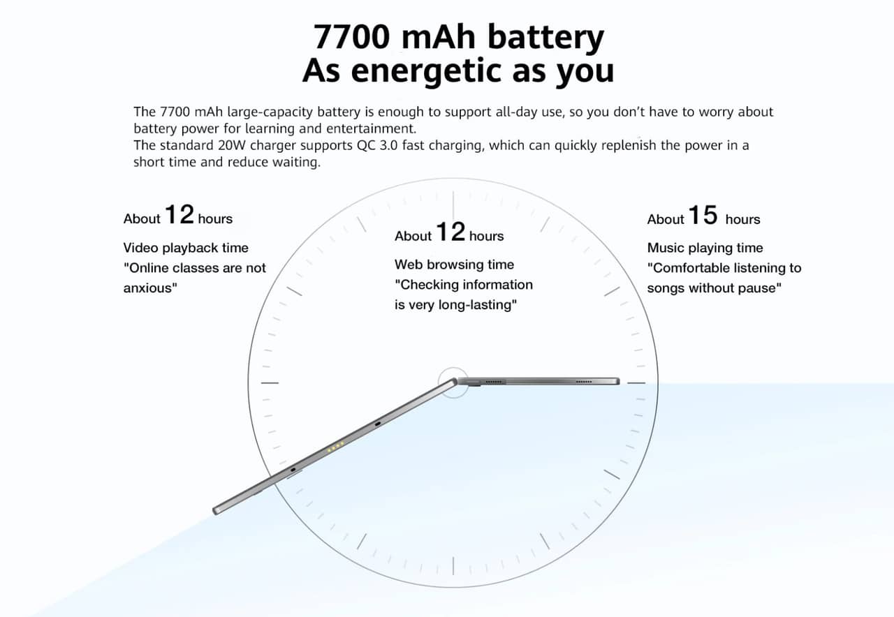 ▼バッテリーの容量も大容量で7,700mAhを確保!動画再生であっても12時間の使用ができるんだそうです!また急速充電も20Wに対応していますよ!↓