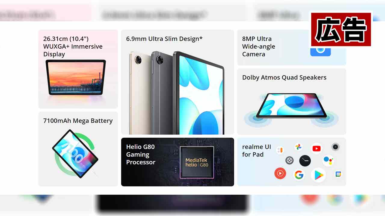 realmeの初代タブレット「realme Pad」がAliExpressにてセール中!Helio G80搭載ミドルレンジスペック、10.4インチディスプレイにクアッドスピーカーを搭載しておりWidevine L1対応と、メディア試聴機にオススメですよ!