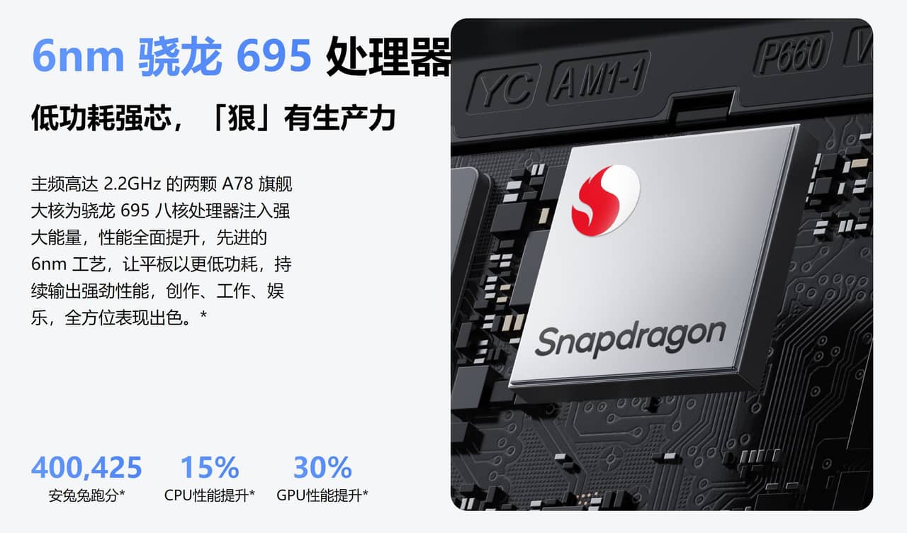 ▼SoCはミドルレンジ上位レベルの性能を持つSnapdragon 695を採用しています!公式によればAnTuTuスコアは40万点ほどとなっており、タブレットながらかなりのパワー。普段使いは間違いなく快適でしょう。ゲームも画質を落とせばイケそう!↓