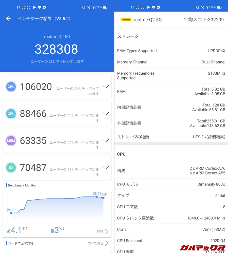 ▼Realme Q2 5Gの実機でAnTuTu(Ver8)を測定しました!総合スコアは328,308点、GPUスコアは88,466点です!この価格帯でここまで高いのは感動モノ。↓