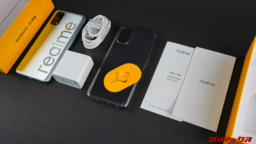 ▼付属品は充電ケーブルに専用のクリアケース、SIMピンにクイックガイドといったフルセット構成。買って開けてすぐに満足に使えるのが嬉しいポイントです!↓