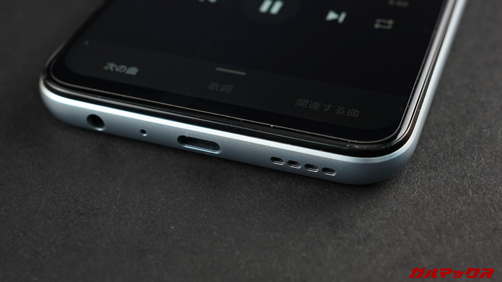 Realme Q2 5Gのスピーカータイプはシングルタイプのモノラル式でした。音質もチープな感じ。携帯ラジオ感覚でトーク動画、番組をタレ流す用途向けって品質です。